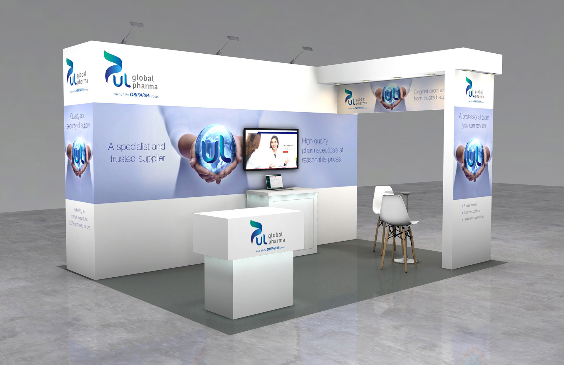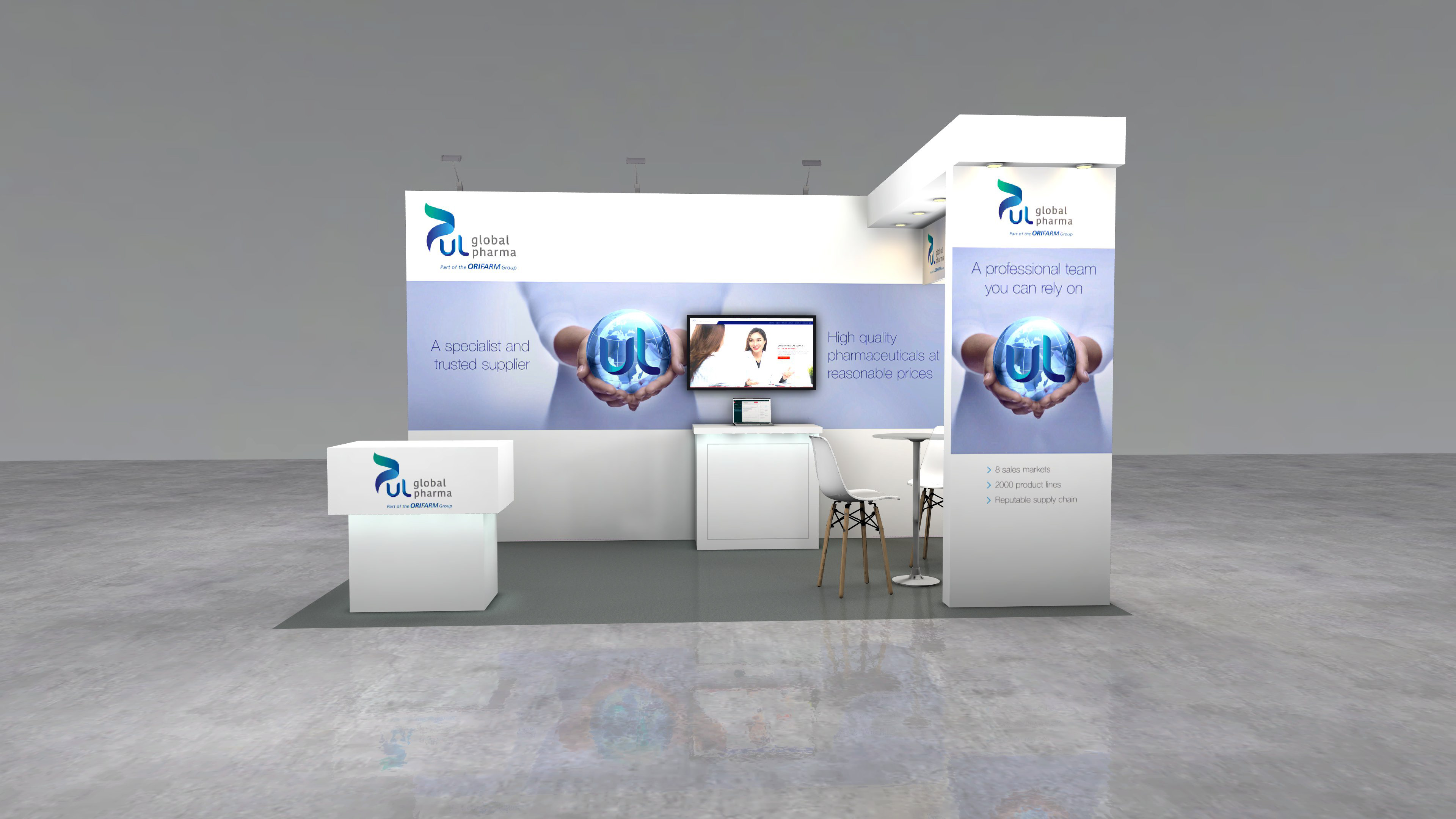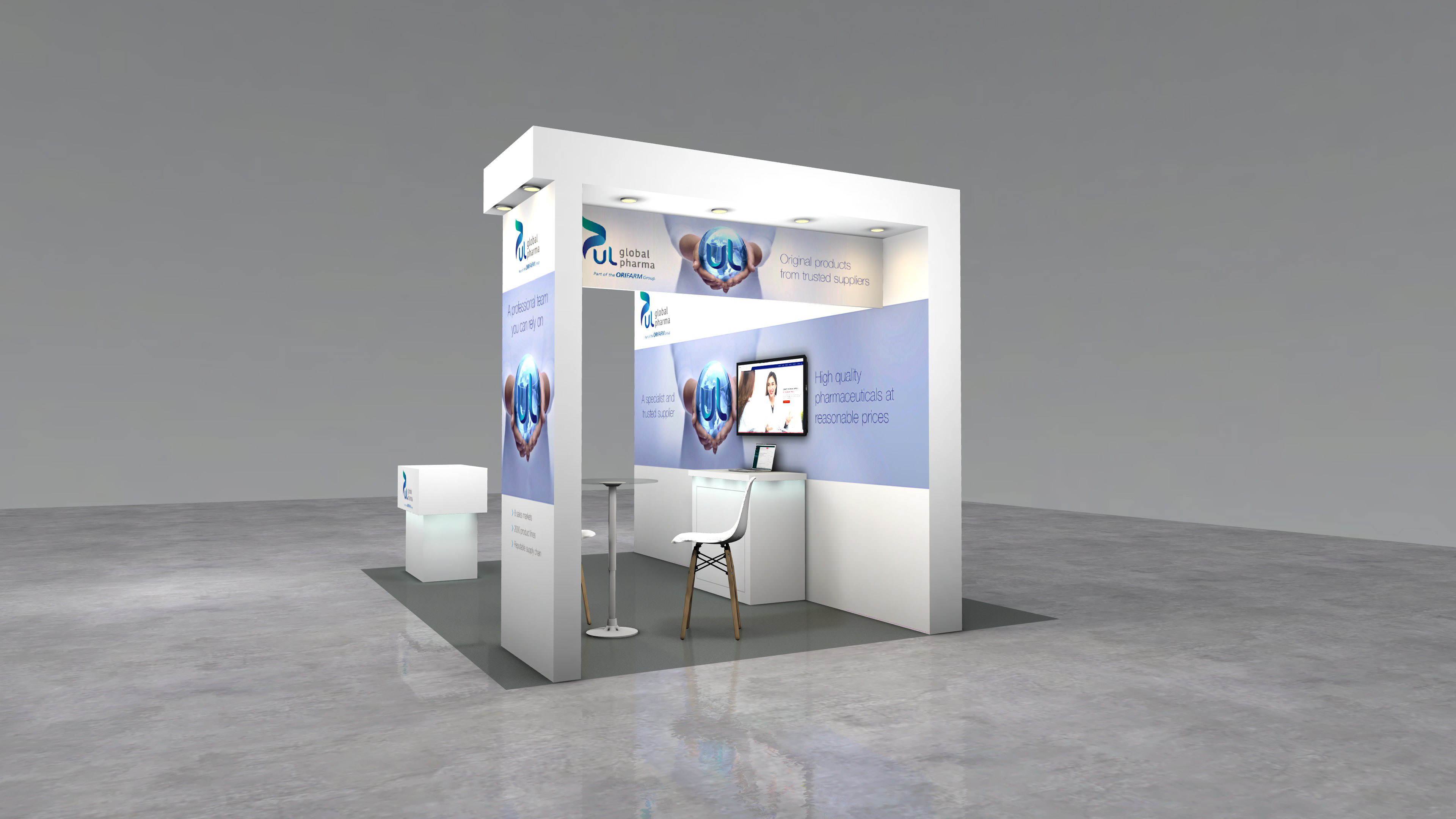 3D Stand design mock up for the UL Parallel Trade show, Orifarm Global Pharma 2021