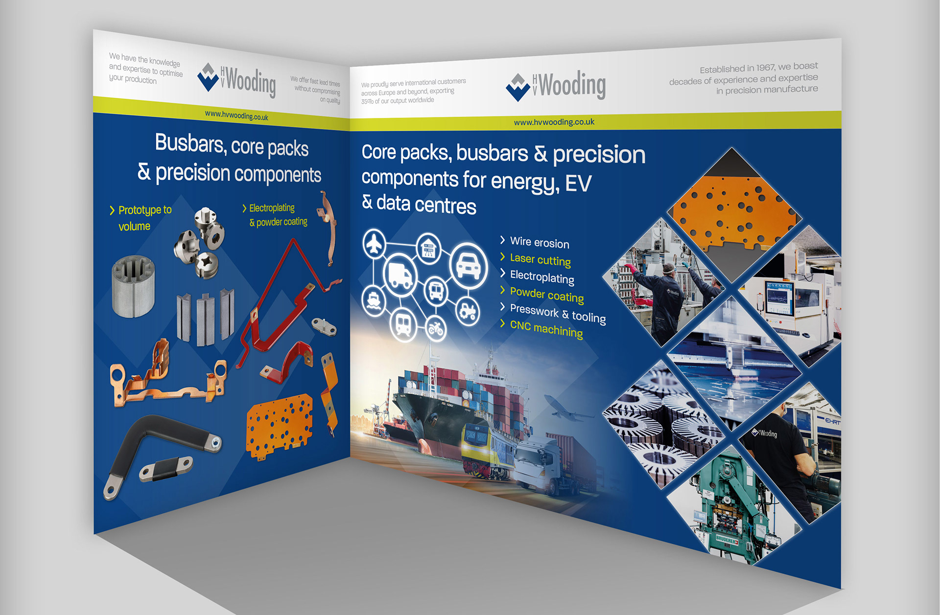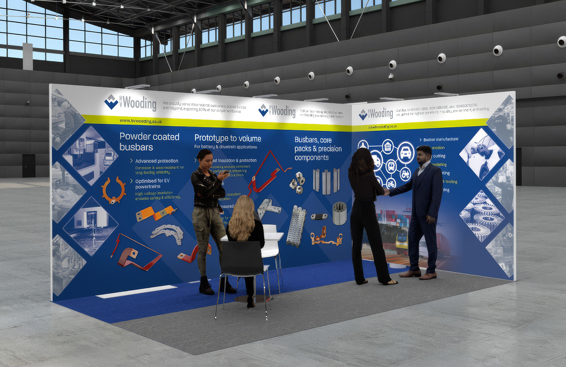 3D mock up stand design for HV Wooding precision manufacturing at Battery Tech Expo Lille and Stuttgart, 2025